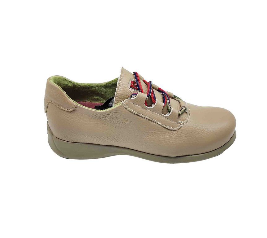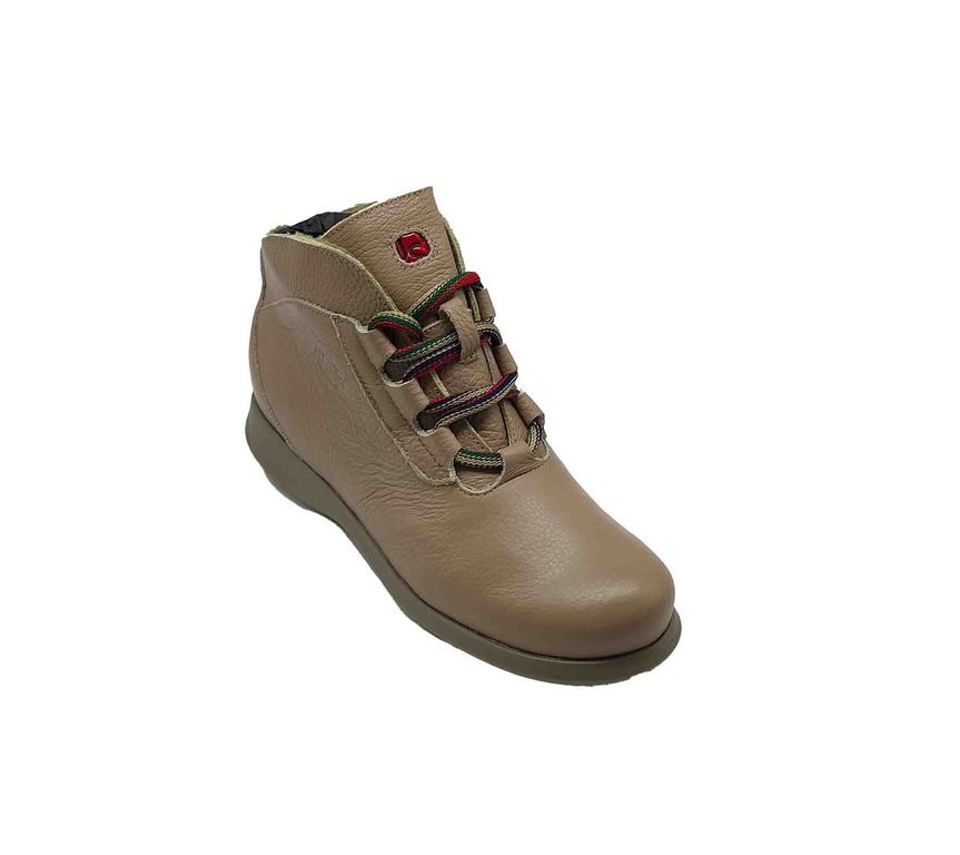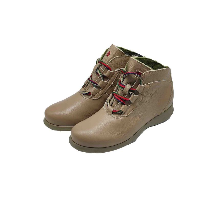 Botines beige en cuero liso con cordones multicolor vibrantes. Diseño casual-elegante con forro estampado verde y suela confort topo. Cordones rayados en rojo, verde y azul que aportan personalidad única. Sistema de ojales integrados en cuero que añade un toque artesanal distintivo. Perfectos para looks casuales con un toque de color y confort premium.