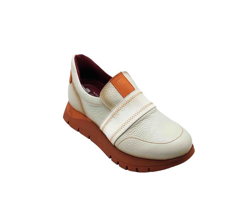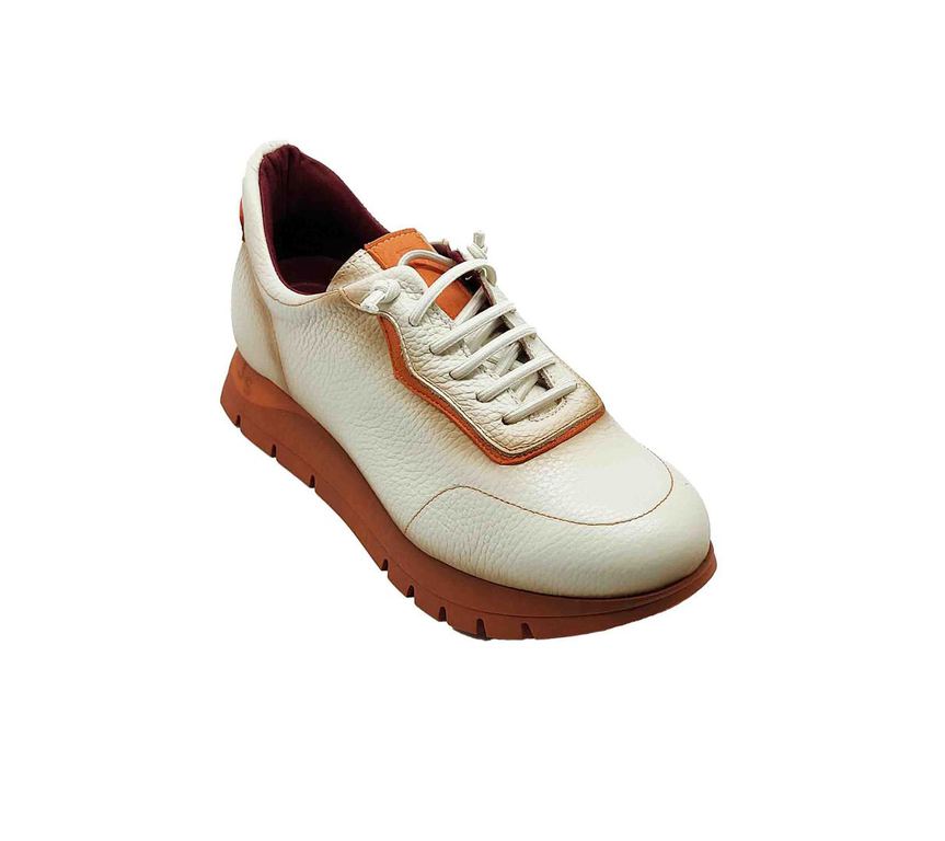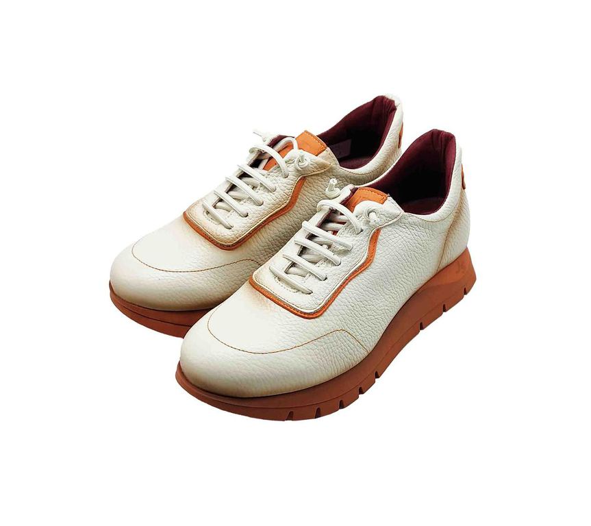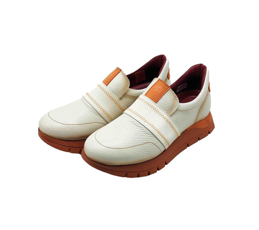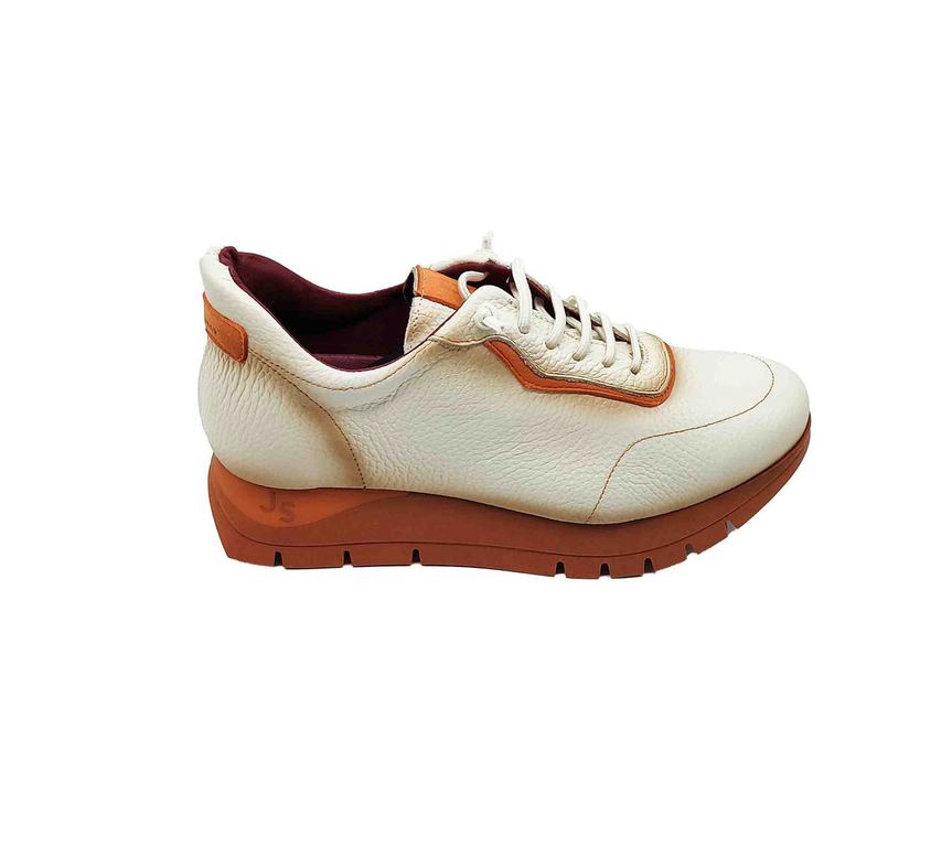 Zapatillas José Saénz en blanco crema con detalles en naranja, cordones blancos y suela gruesa para un look fresco y moderno.