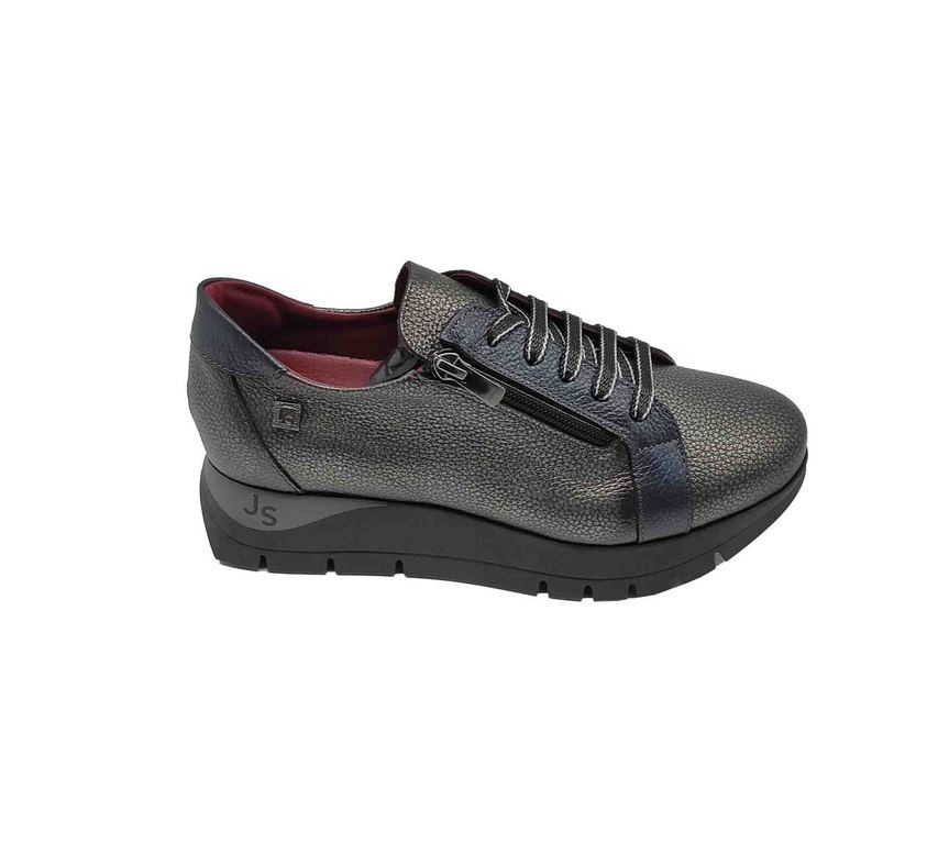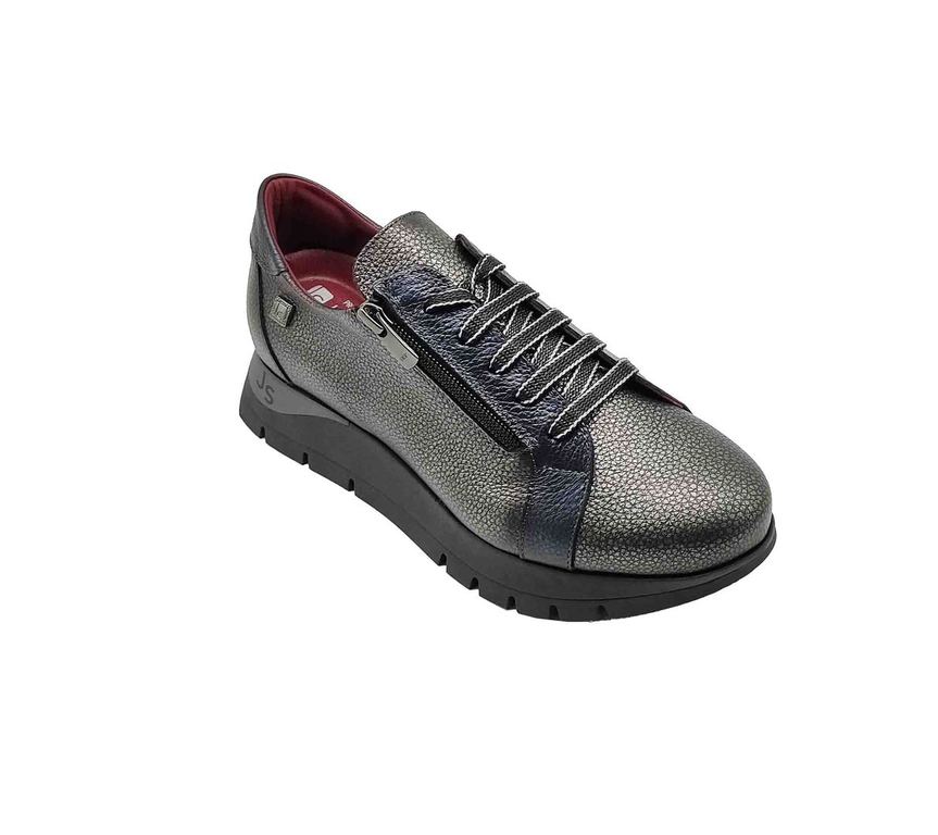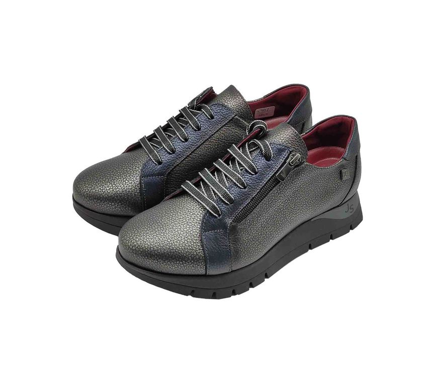 Descubre los elegantes sneakers de mujer José Saenz, con piel texturizada en tonos gris metálico y azul marino.