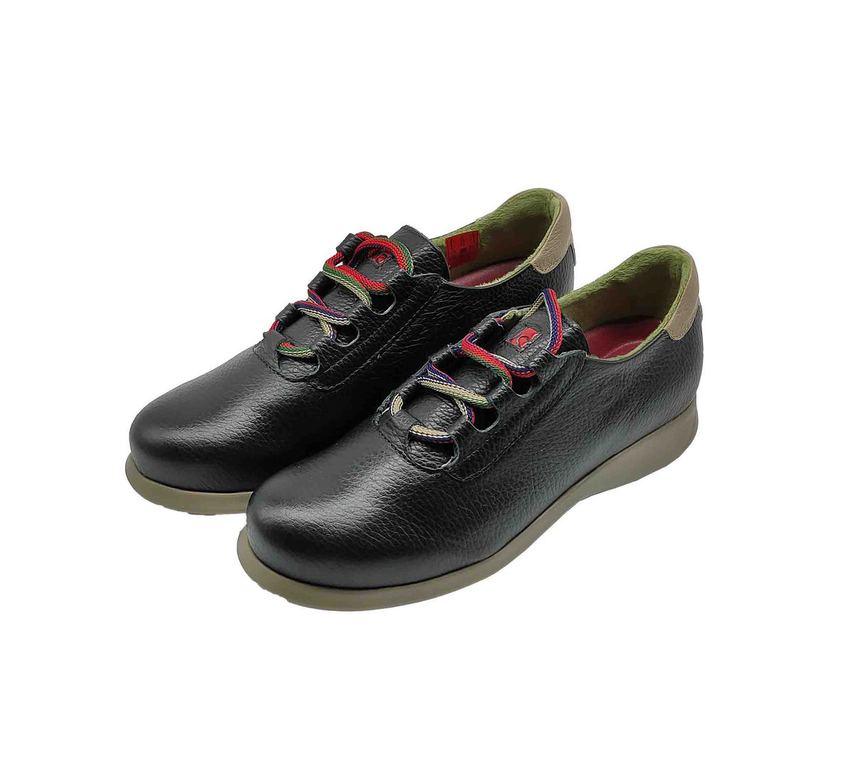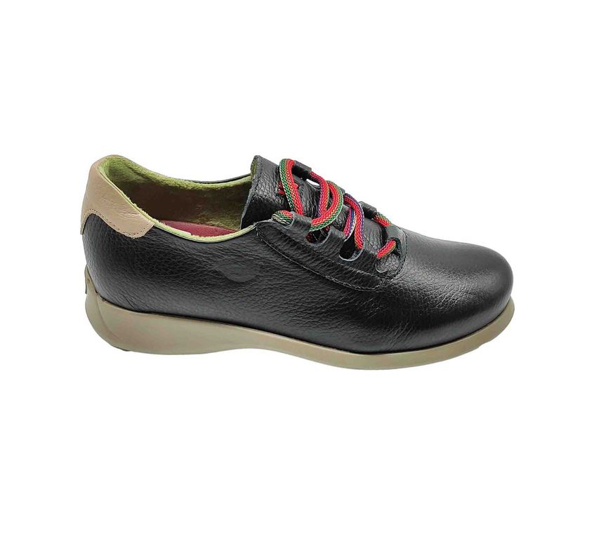 Botines negros en cuero granulado con cordones multicolor vibrantes. Diseño casual-elegante con forro verde oliva y suela confort beige. Cordones tejidos en rojo, verde, marrón y morado que aportan personalidad única. Logo rojo distintivo en la lengüeta que añade un toque de marca premium. Perfectos para looks casuales con un toque de color y estilo contemporáneo.