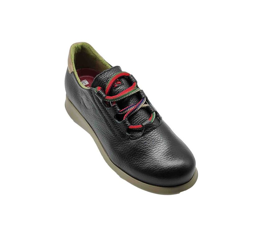 Zapatillas José Saénz en negro texturizado con cordones multicolor y suela beige, combinando estilo clásico y toque divertido.