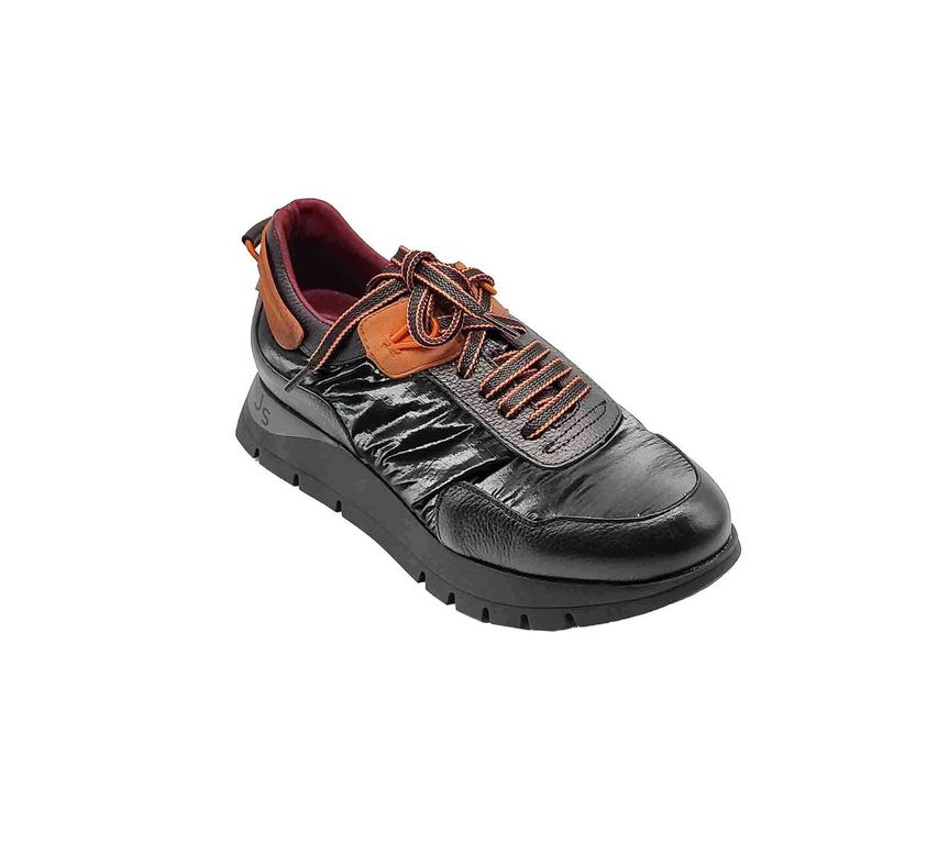 Zapatillas José Saénz en negro brillante con detalles en naranja, cordones contrastantes y suela gruesa para un look urbano y moderno.