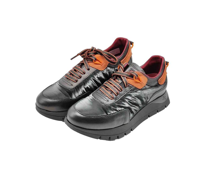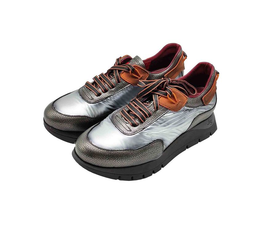 Zapatillas José Saénz en plateado metálico con detalles en naranja y cordones contrastantes, para un look urbano y sofisticado.