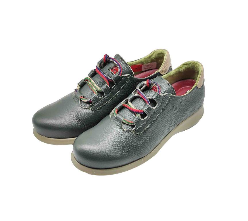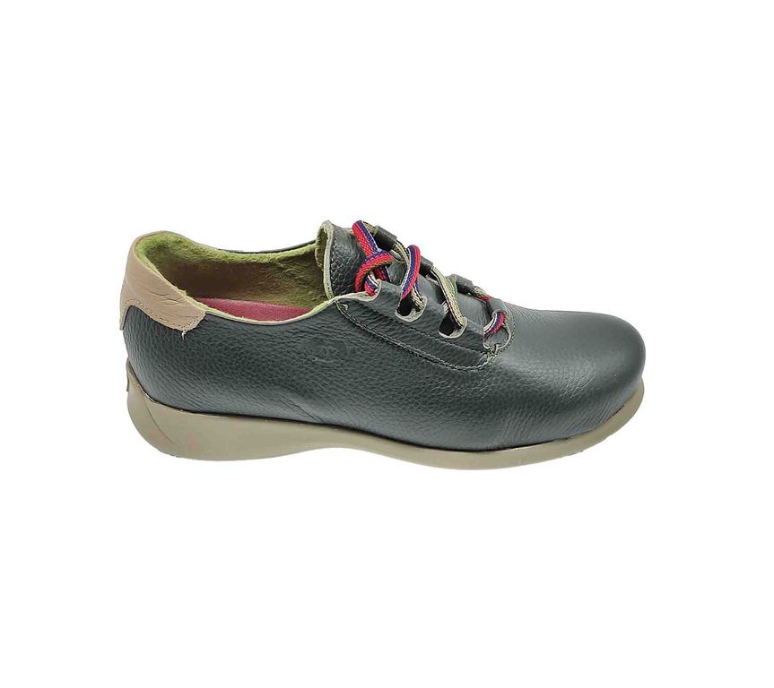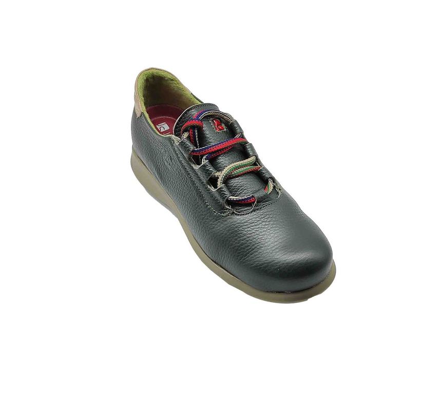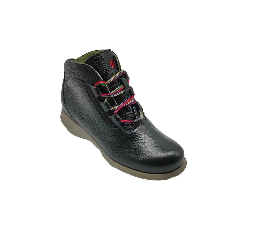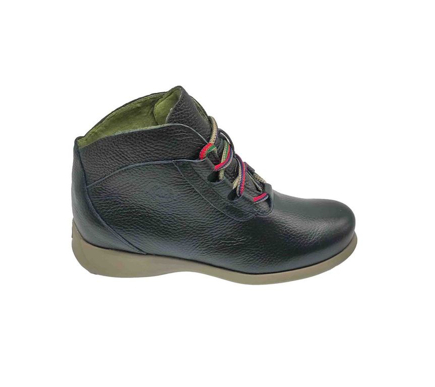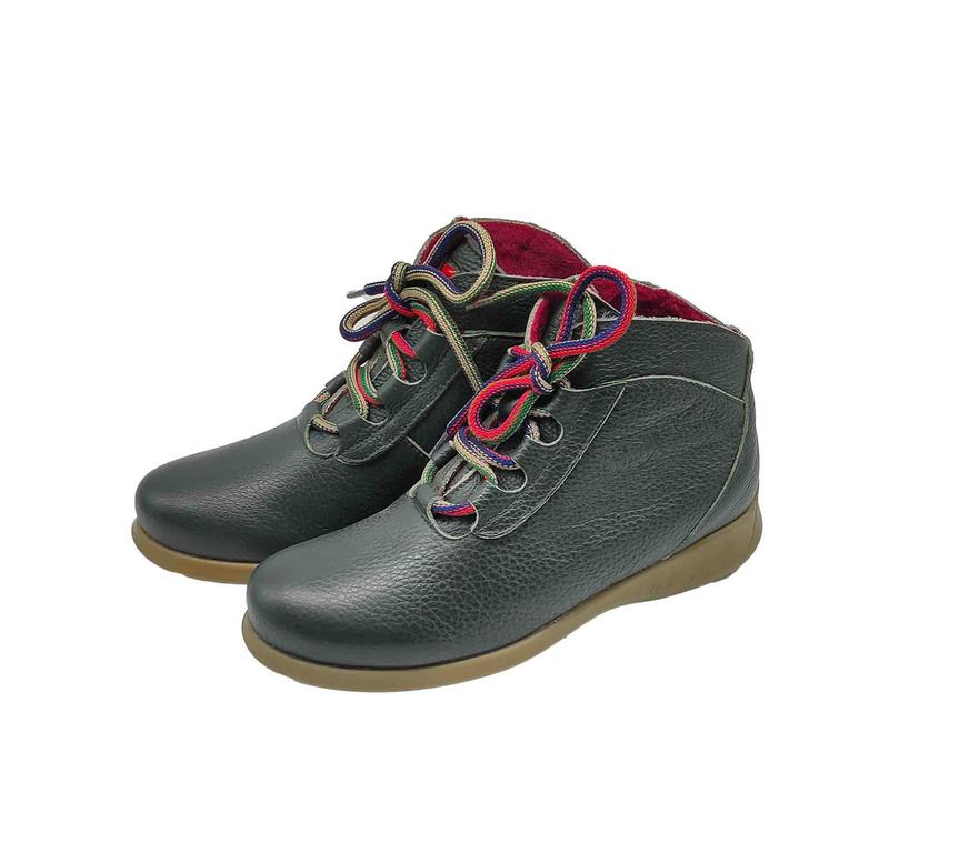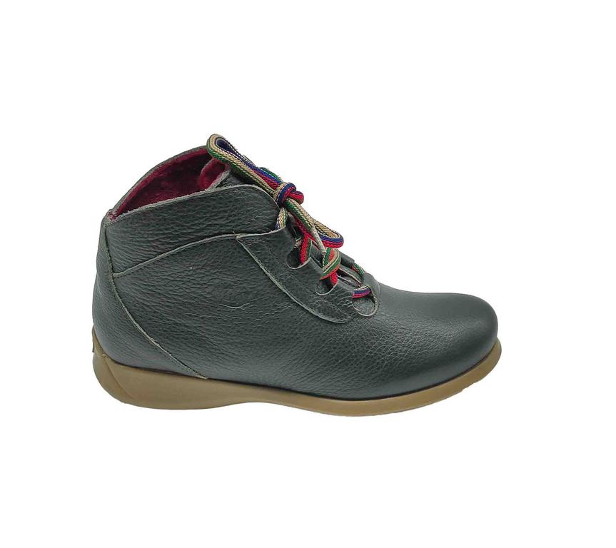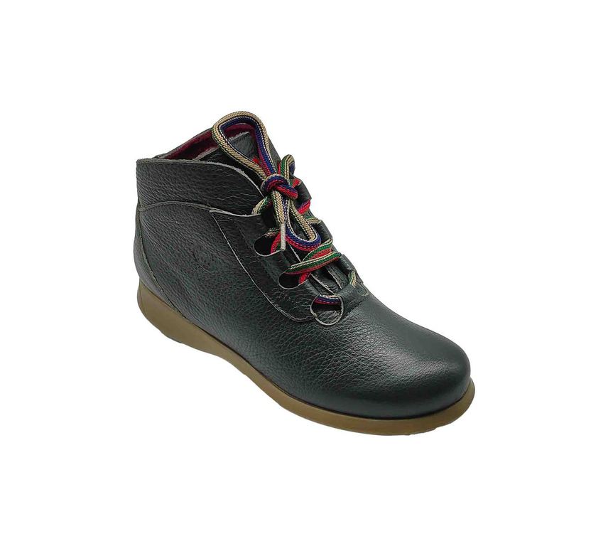Botines verdes en cuero granulado con cordones multicolor vibrantes. Diseño casual-elegante con collar acolchado burdeos y suela goma natural. Cordones trenzados en rojo, azul, verde y beige que aportan personalidad única. Ojales metálicos tipo D que añaden un toque outdoor funcional y resistente. Perfectos para looks casuales con un toque de color y confort premium.