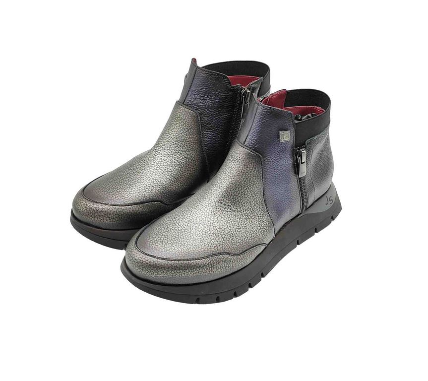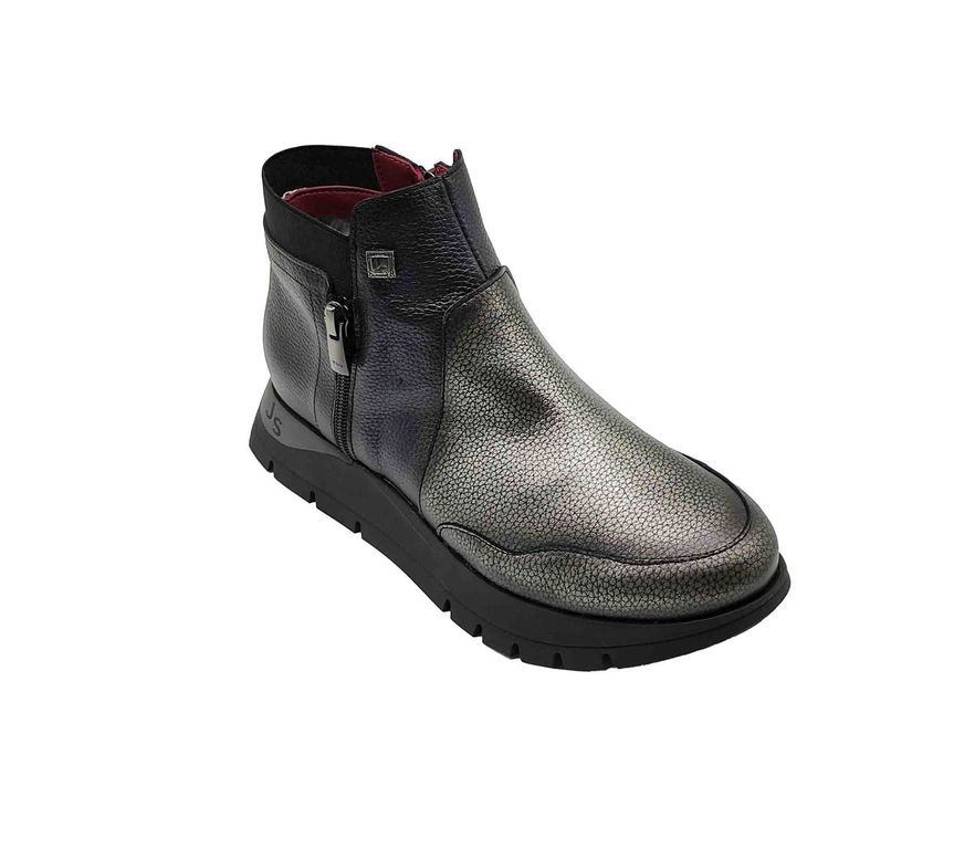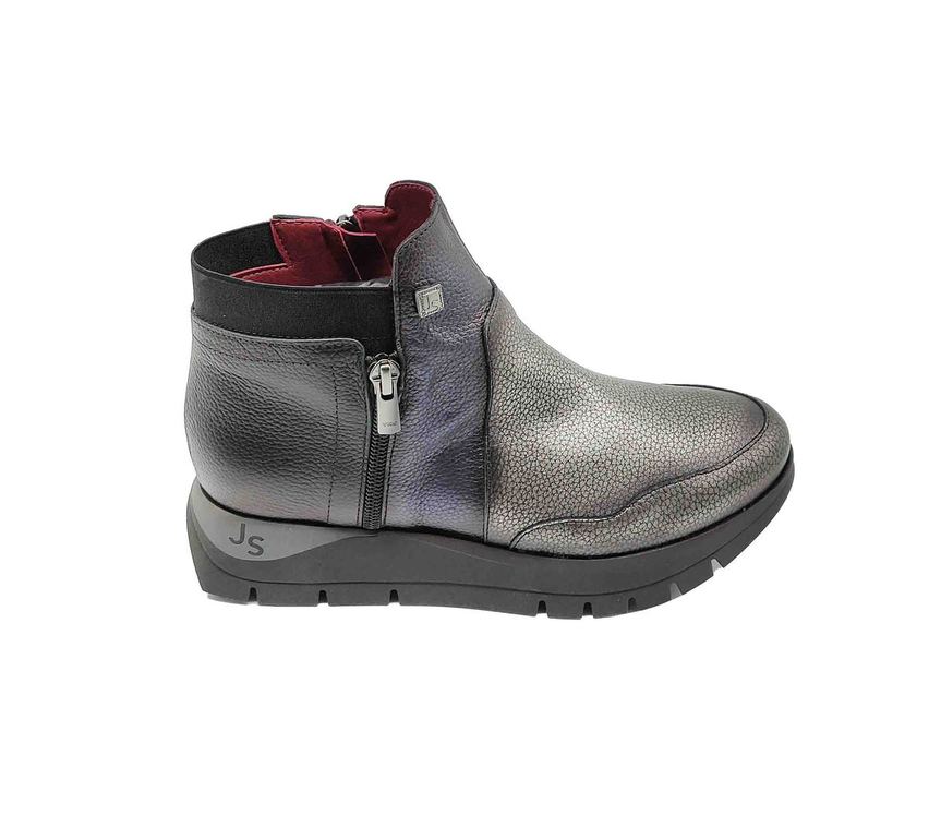 Botines José Saénz en gris metálico con textura granulada, cierre lateral de cremallera y suela gruesa para un estilo urbano y cómodo.