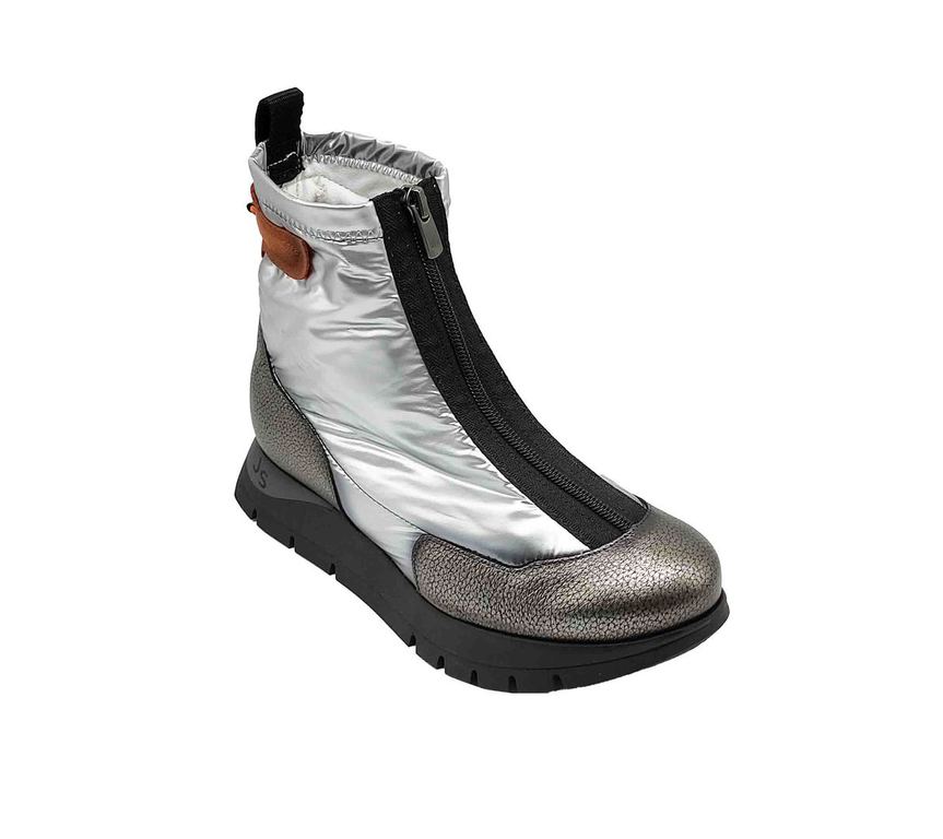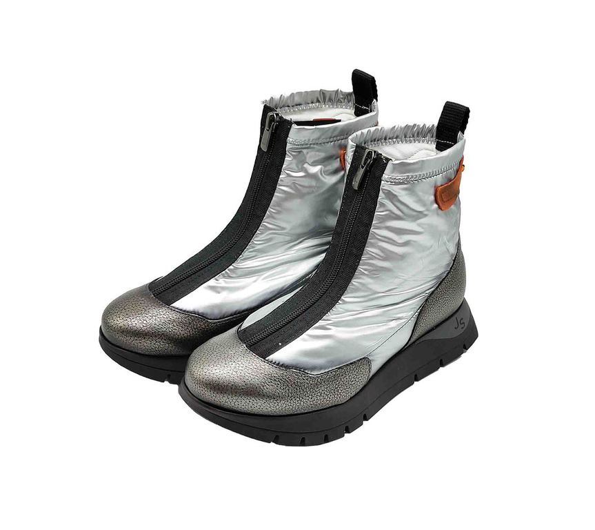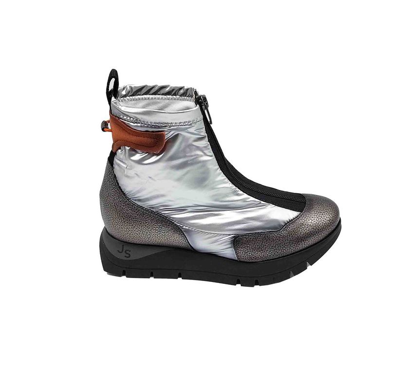 Botines José Saénz en plateado metálico con detalles en negro y naranja, cierre de cremallera lateral y suela gruesa para un look futurista y cómodo.