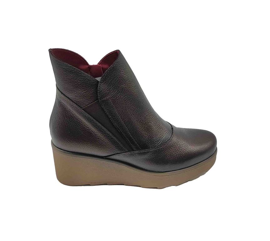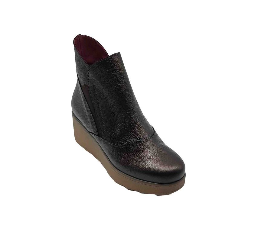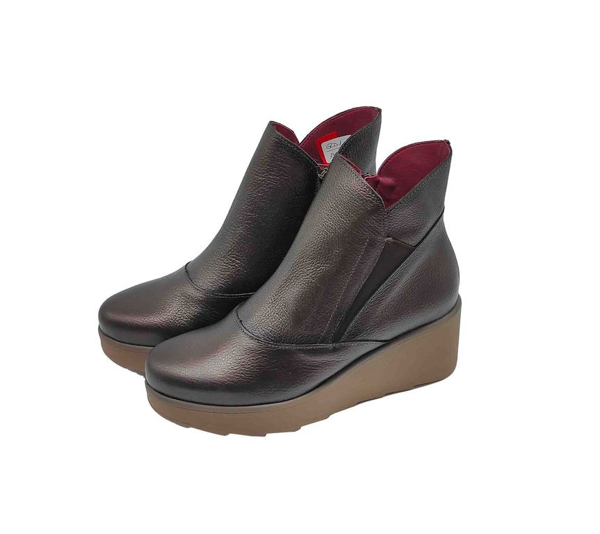 Botines José Saénz en cuero bronce metalizado con plataforma cuña beige. Diseño moderno con cremallera lateral y elásticos para fácil calce. Collar recortado en V que aporta un toque contemporáneo y elegante. Forro interior rojo intenso que añade un detalle distintivo y sofisticado. Perfectos para looks casuales y formales con altura y confort premium.