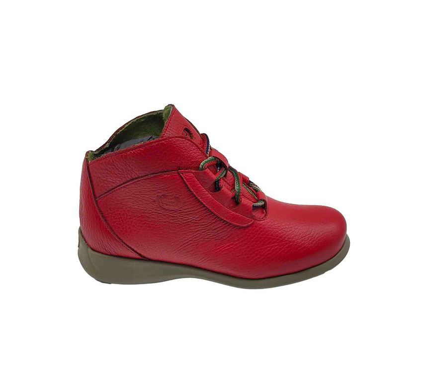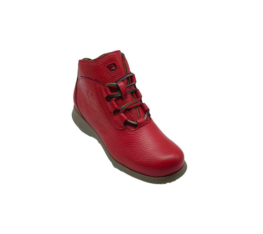 Botines rojos en cuero granulado con cordones multicolor vibrantes. Diseño casual-elegante con forro verde oliva y suela confort taupe. Cordones tejidos en azul, verde, rojo y amarillo que aportan personalidad única. Sistema de ojales en cuero rojo que añade un toque artesanal distintivo. Perfectos para looks casuales con un toque de color y estilo contemporáneo.