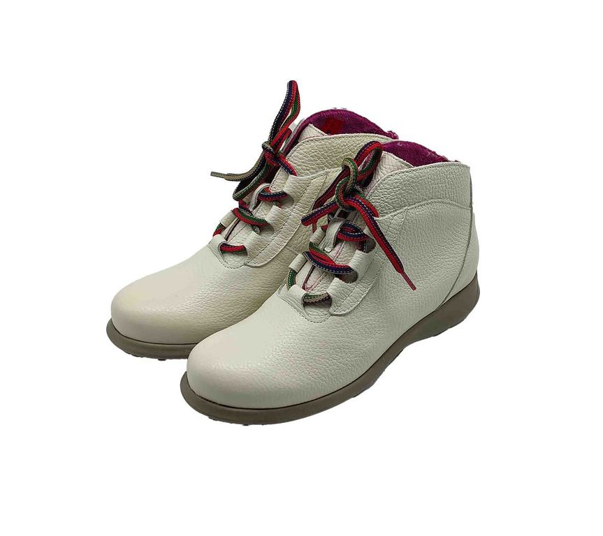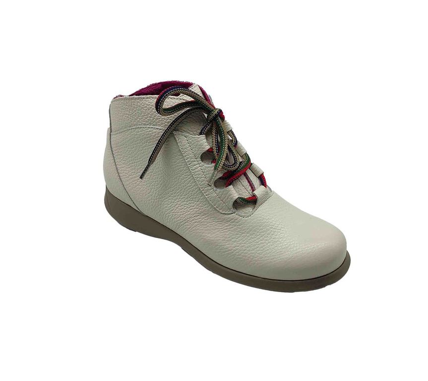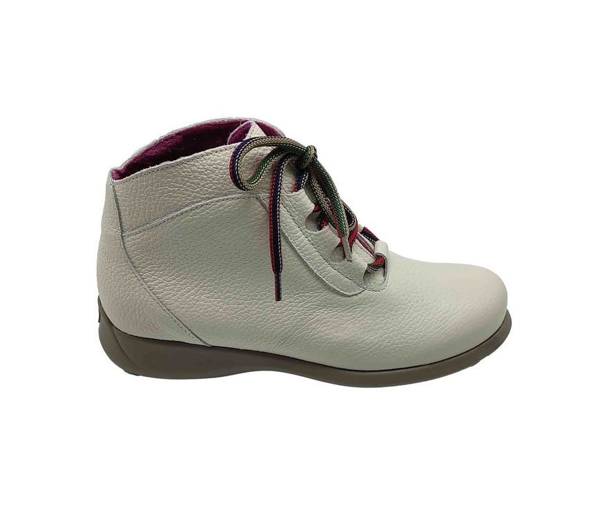 Botines crema en cuero granulado con cordones multicolor vibrantes. Diseño casual-elegante con collar acolchado burdeos y suela confort marrón. Cordones tejidos en rojo, verde y azul marino que aportan personalidad única. Sistema de ojales en tela a juego que añade un toque artesanal distintivo. Perfectos para looks casuales con un toque de color y confort premium.