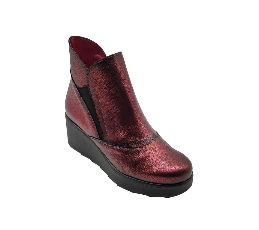 Este par de botines de caña corta captura la atención con su vibrante y audaz color rojo metálico o borgoña iridiscente, ofreciendo un toque de sofisticación