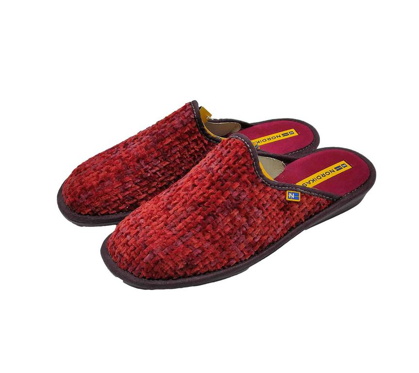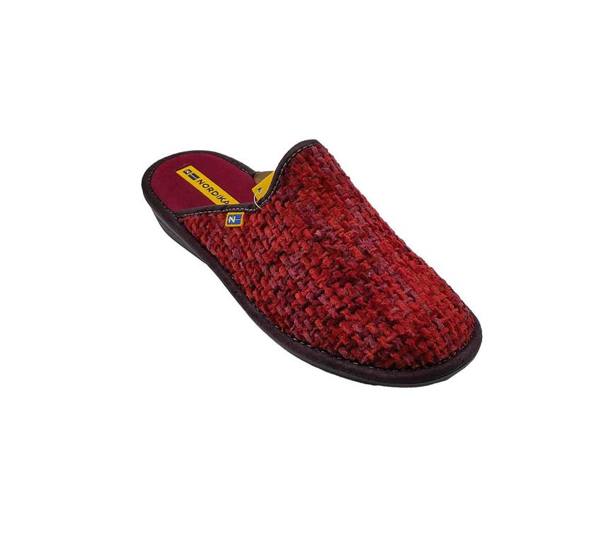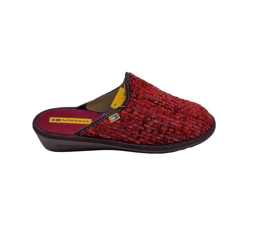 Zapatillas NORDIKA'S en rojo con textura tejida y diseño destalonado para calzar con facilidad. Interior cálido y suela negra resistente, ideales para el confort diario en casa. Etiqueta bordada y estilo clásico que combina funcionalidad y estética. ¡Tu refugio perfecto para los días fríos sin renunciar al estilo! #Nordikas #ConfortEnCasa #EstiloInvierno