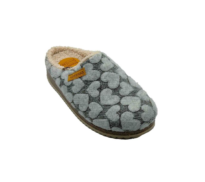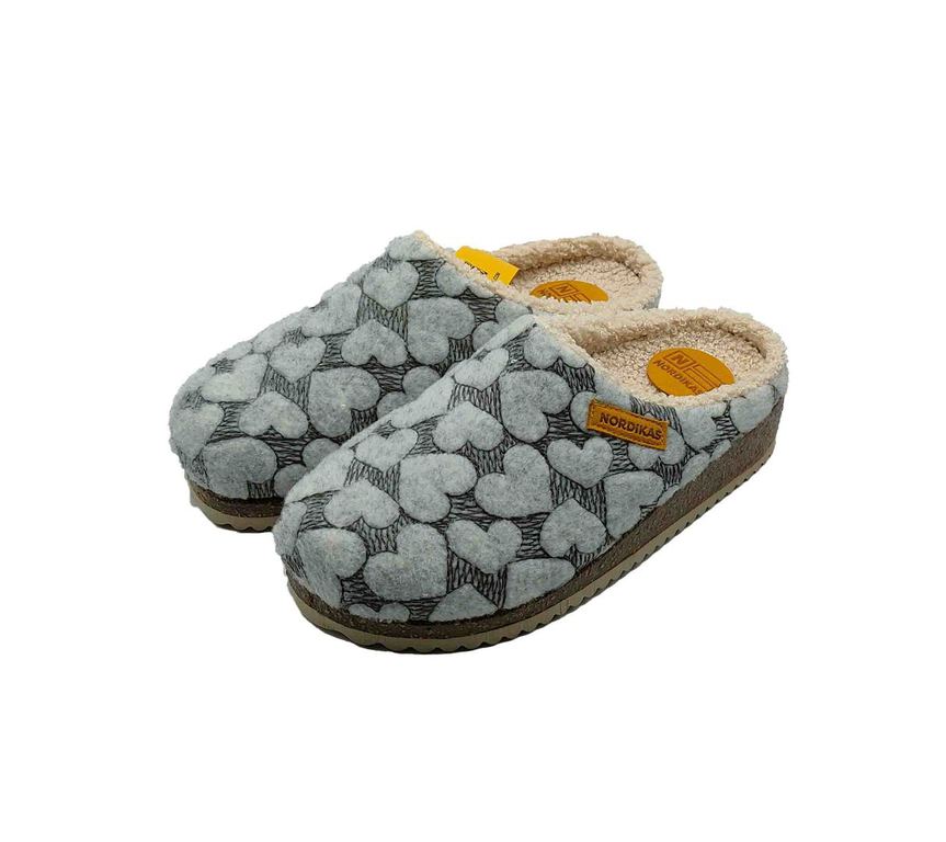 Zapatillas NORDIKAS en gris con estampado de corazones y textura suave tipo peluche. Interior de borreguito beige que aporta abrigo y confort en cada paso. Suela firme y diseño cerrado, ideales para el invierno en casa. ¡Un toque dulce y acogedor para tus momentos de relax! #Nordikas #ConfortConEstilo #InviernoEnCasa