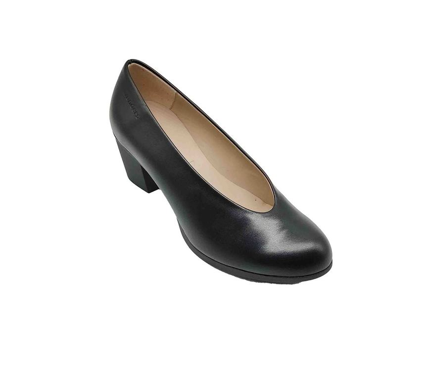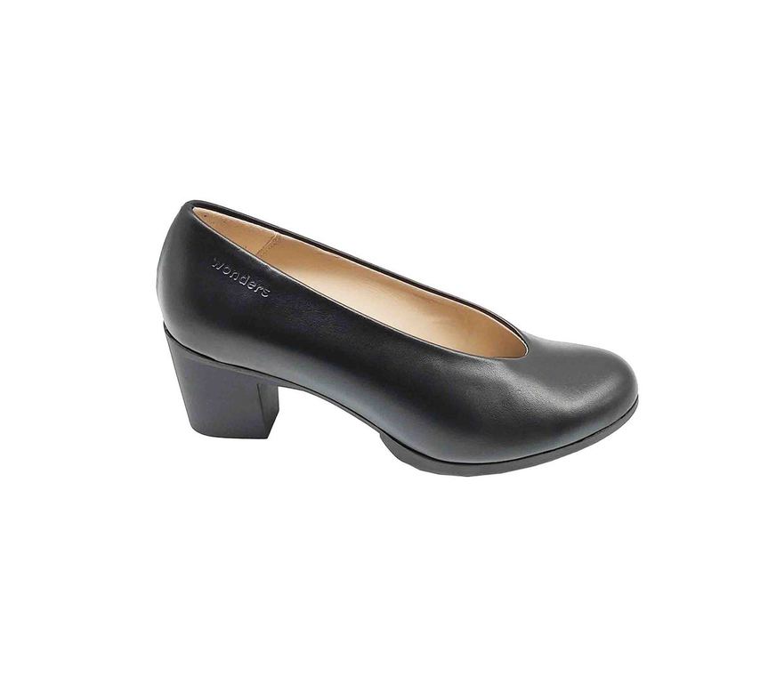 Elegantes zapatos de la marca Wonders en cuero negro, con un diseño atemporal de salón y tacón ancho para mayor estabilidad y comodidad. Su estilo clásico los convierte en un básico perfecto para el día a día en la oficina o para cualquier evento especial que requiera un calzado sofisticado y cómodo.