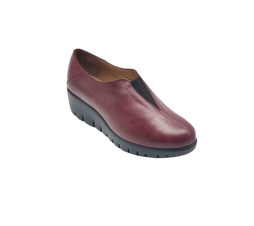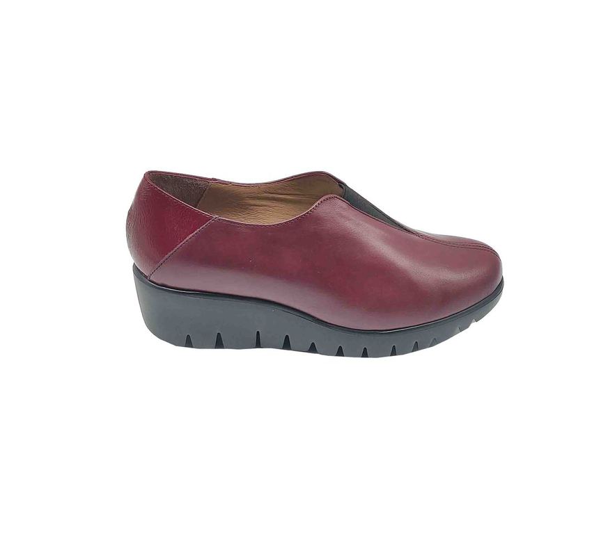 Elegantes zapatos de la marca Wonders en cuero color burdeos, con un diseño sin cordones para un calce sencillo. Su suela de cuña gruesa con acabado dentado ofrece una pisada cómoda y segura, perfectos para el día a día. Una opción sofisticada y versátil que combina confort y estilo.