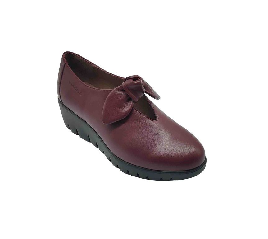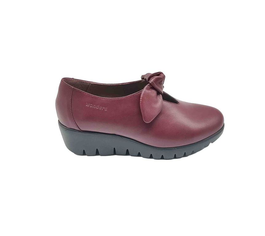 Elegantes zapatos de la marca Wonders en cuero color burdeos, con un detalle de lazo en la parte delantera que les da un toque femenino. Su suela de cuña gruesa con acabado dentado ofrece una pisada cómoda y segura, perfectos para el día a día. Una opción sofisticada y versátil que combina confort y estilo.