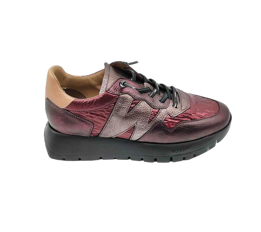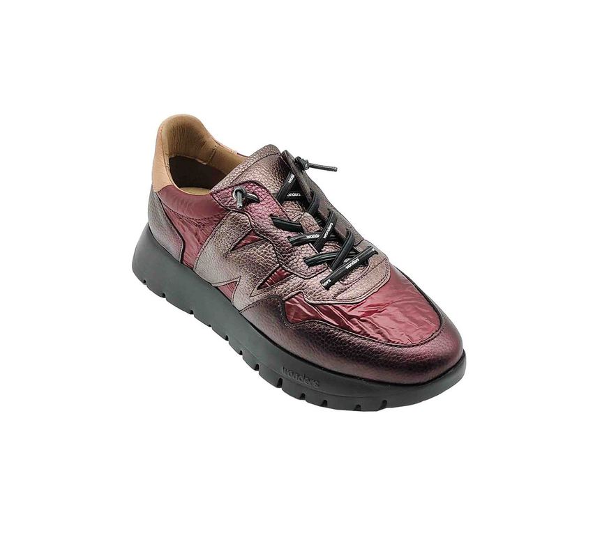 Originales zapatillas de la marca Wonders, con un acabado en color metalizado burdeos que les da un look futurista. Cuentan con detalles en contraste en la parte trasera y una suela gruesa que ofrece comodidad y estabilidad. Ideales para un estilo urbano y atrevido.