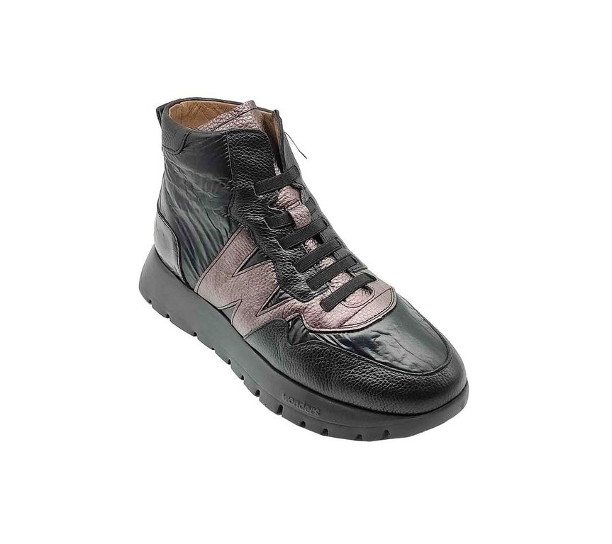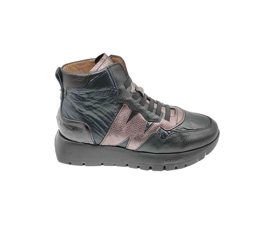 Originales botines de la marca Wonders, con un diseño que combina cuero negro y detalles metalizados en tonos cobrizos. Cuentan con un cierre de cordones para un ajuste perfecto y una suela gruesa que ofrece comodidad y estabilidad. Ideales para un estilo urbano y atrevido.