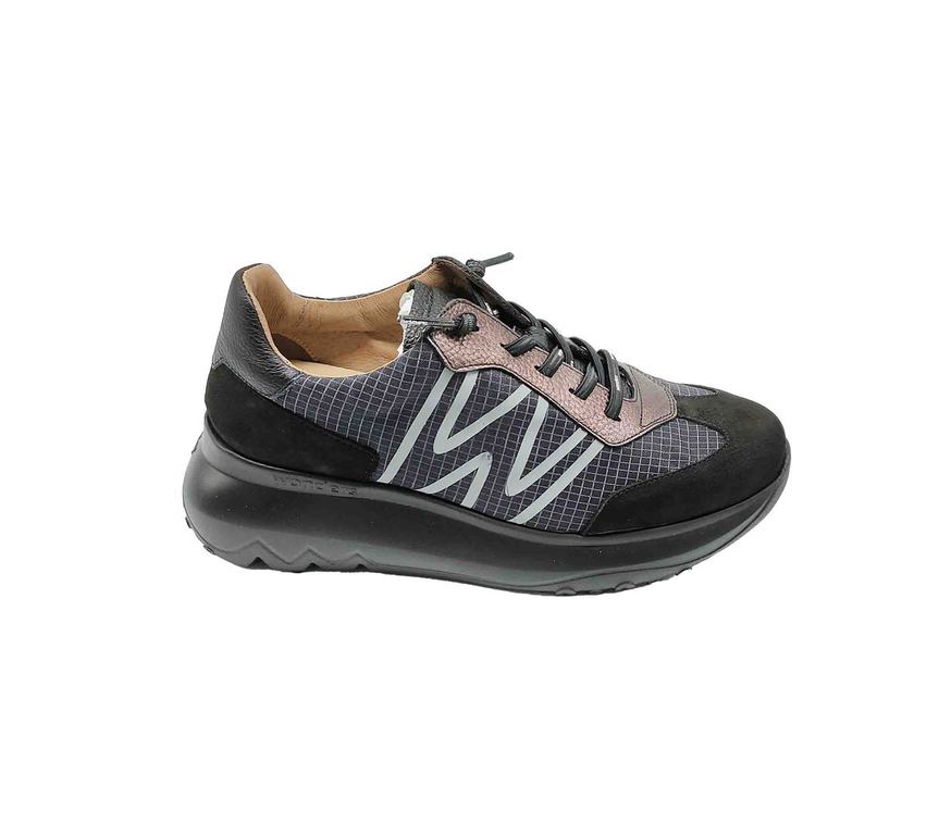 Zapatillas Wonders en negro con detalles en gris y cobre metálico, cordones personalizados y suela gruesa para un look urbano y tecnológico.