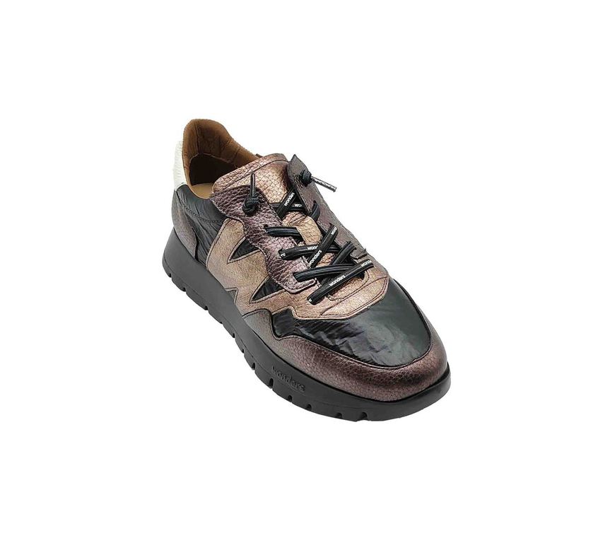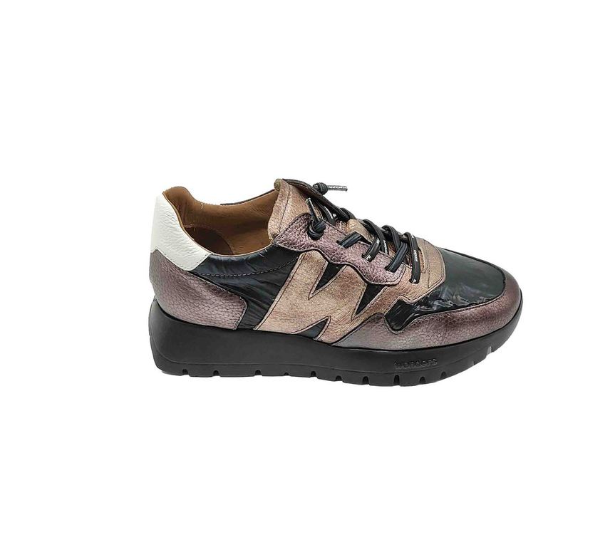Zapatillas Wonders en negro y cobre metálico con detalles en blanco, cordones personalizados y suela gruesa para un look sofisticado y moderno.