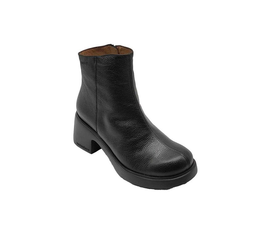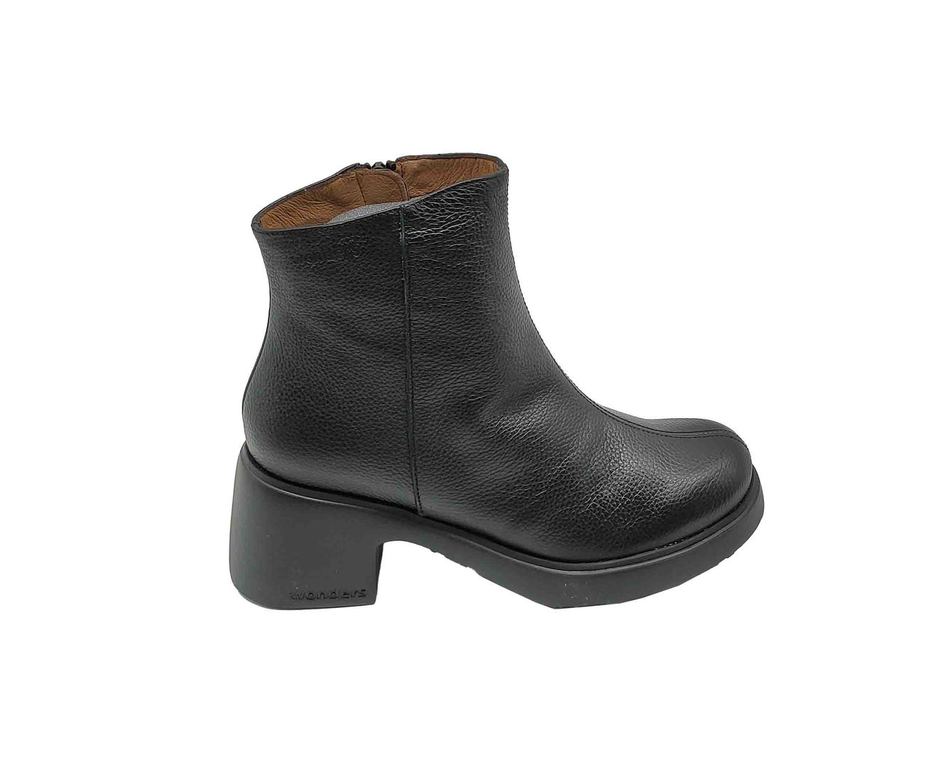 Botines Wonders negros en cuero granulado con cremallera frontal central. Diseño minimalista moderno con forro interior marrón contrastante y suela plataforma. Tacón robusto que aporta altura y estabilidad sin sacrificar comodidad. Puntera redondeada que garantiza confort durante todo el día de uso. Perfectos para looks casuales y formales con elegancia contemporánea distintiva.