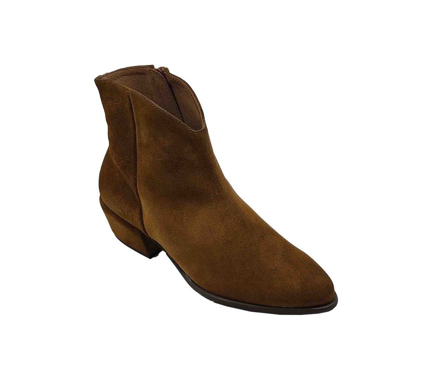 Botines Wonders camel en ante suave con cremallera lateral discreta. Diseño elegante con puntera almendrada y tacón bajo estilo western. Collar recortado en V que aporta un toque contemporáneo y sofisticado. Forro interior claro que garantiza confort y transpirabilidad durante todo el día. Perfectos para looks casuales y formales con elegancia atemporal distintiva.