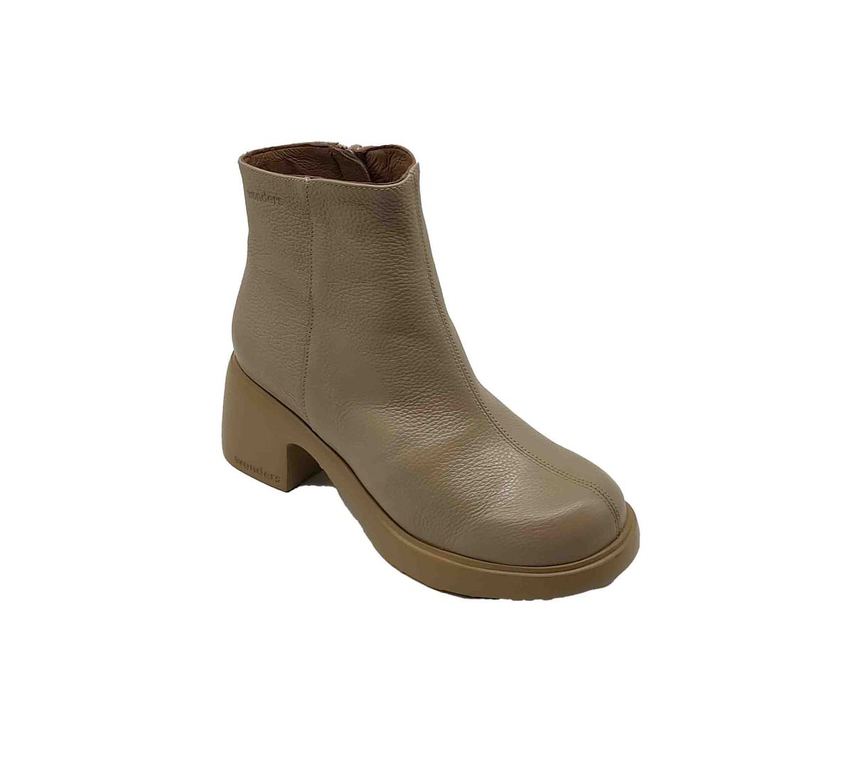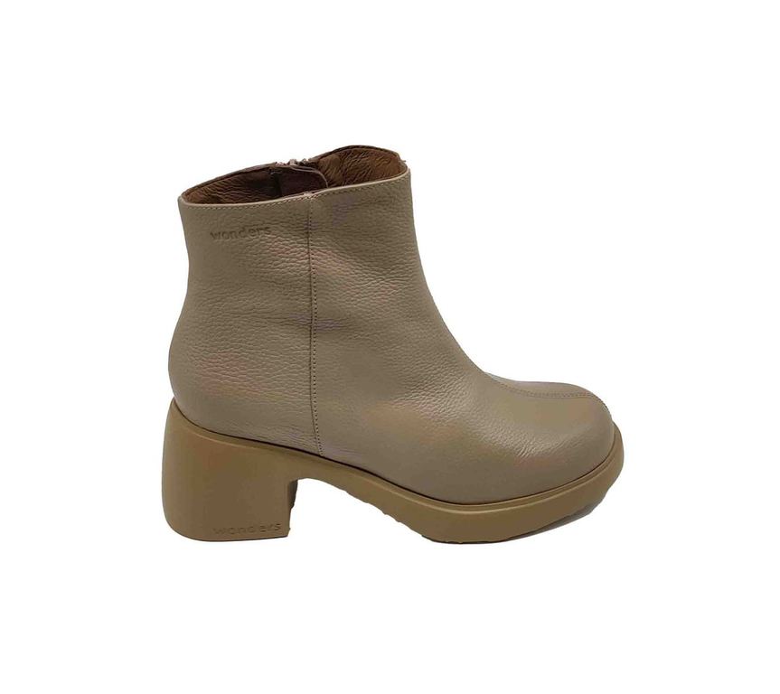Botines Wonders taupe en cuero granulado con cremallera lateral funcional. Diseño minimalista moderno con suela plataforma y tacón robusto a juego. Puntera redondeada y costura central que aportan elegancia contemporánea distintiva. Forro interior suave que garantiza confort y transpirabilidad durante todo el día. Perfectos para looks casuales y formales con sofisticación neutra atemporal.