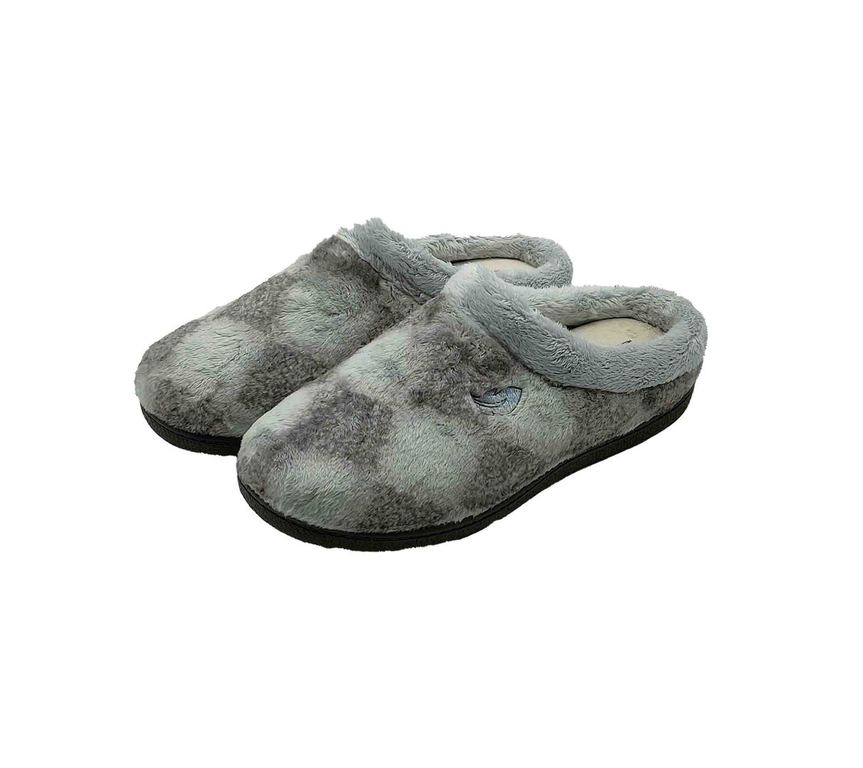 Zapatillas de casa con estampado de cuadros en tonos gris y verde, textura peluche y cuello acolchado. Interior mullido y suela negra resistente, pensadas para máximo confort en invierno. Diseño cerrado y estilo acogedor que invita al relax diario. ¡Perfectas para disfrutar del calor del hogar con suavidad y estilo! #ZapatillasInvierno #ConfortEnCasa #EstiloAcogedor