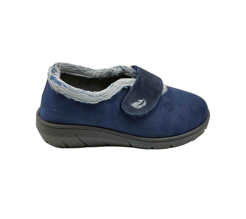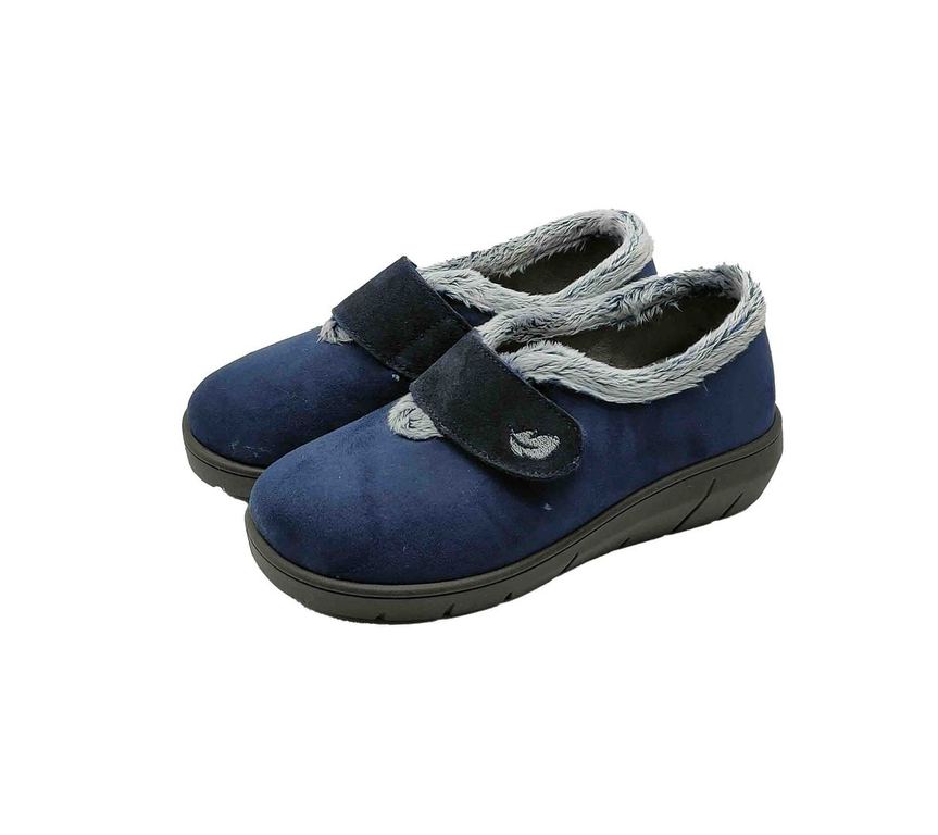 Zapatillas de casa para mujer en azul marino con exterior tipo peluche y forro gris claro de pelo sintético. Cierre ajustable con velcro y suela antideslizante para mayor comodidad y seguridad. Diseño envolvente y cálido, ideal para los días fríos en casa. ¡Perfectas para combinar confort, practicidad y estilo invernal! #ZapatillasMujer #ConfortEnCasa #EstiloInvierno