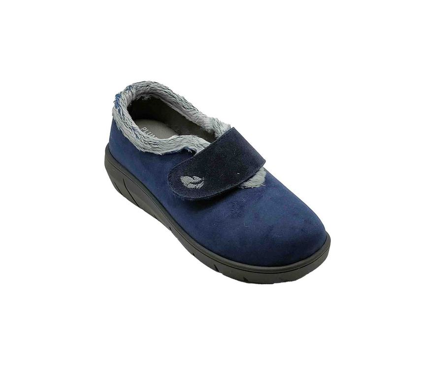 Cómodas zapatillas de casa de la marca Plumaflex para mujer. Con un suave exterior de terciopelo en color azul y un interior de pelo que te mantendrá los pies abrigados. Ideales para el día a día, su diseño simple y acogedor las convierte en el calzado perfecto para relajarte en casa.