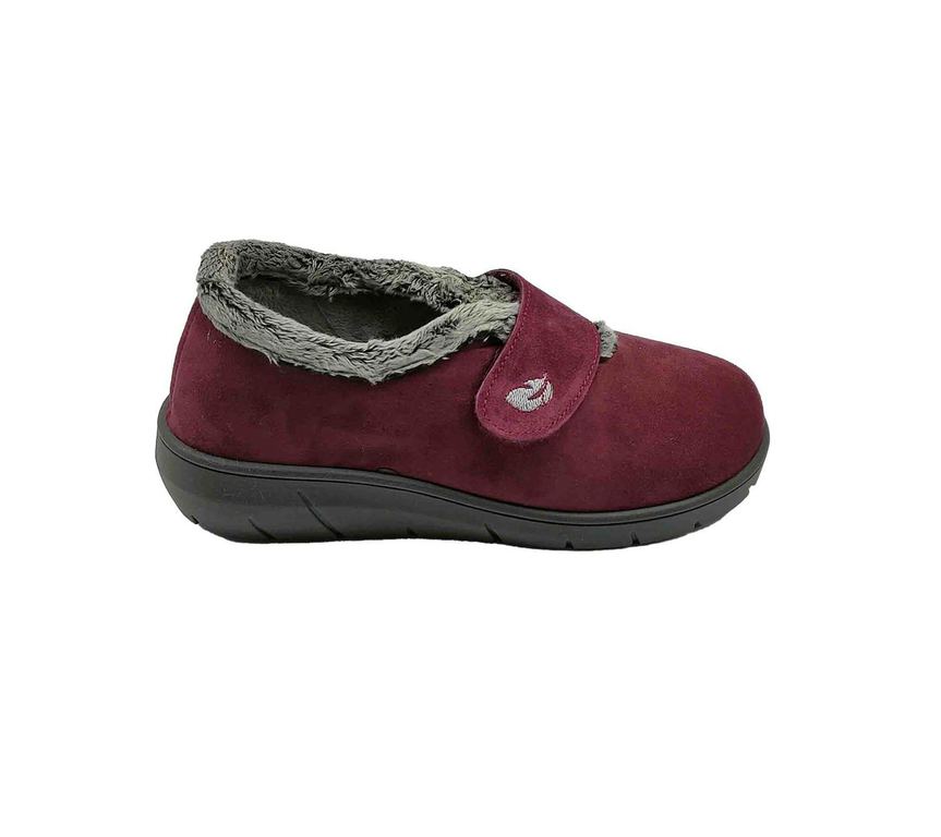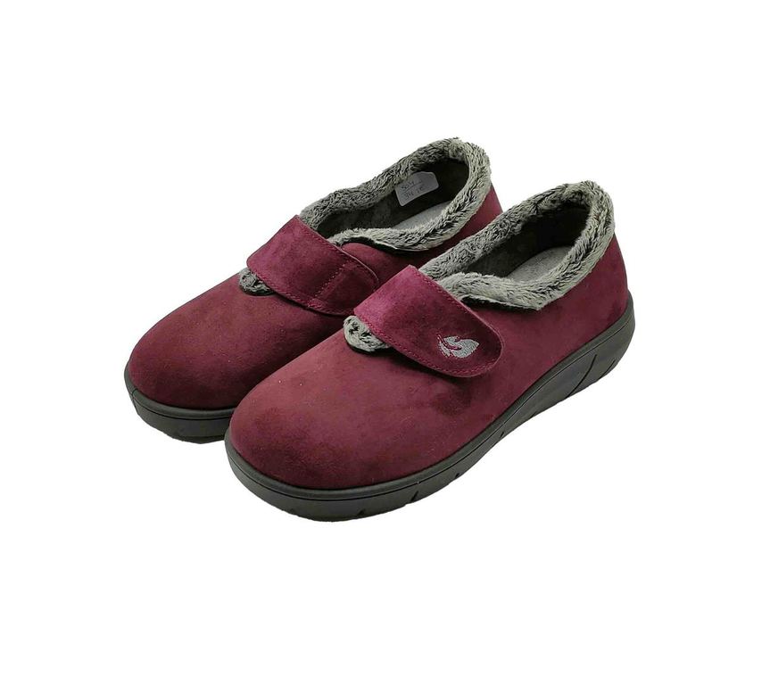 Zapatillas de casa para mujer en burdeos con exterior tipo ante y forro gris de pelo sintético. Cierre con velcro bordado y suela negra antideslizante para mayor ajuste y seguridad. Diseño cálido y funcional, ideal para el confort diario en invierno. ¡Perfectas para combinar estilo, comodidad y practicidad en casa! #ZapatillasMujer #ConfortInvernal #EstiloFuncional