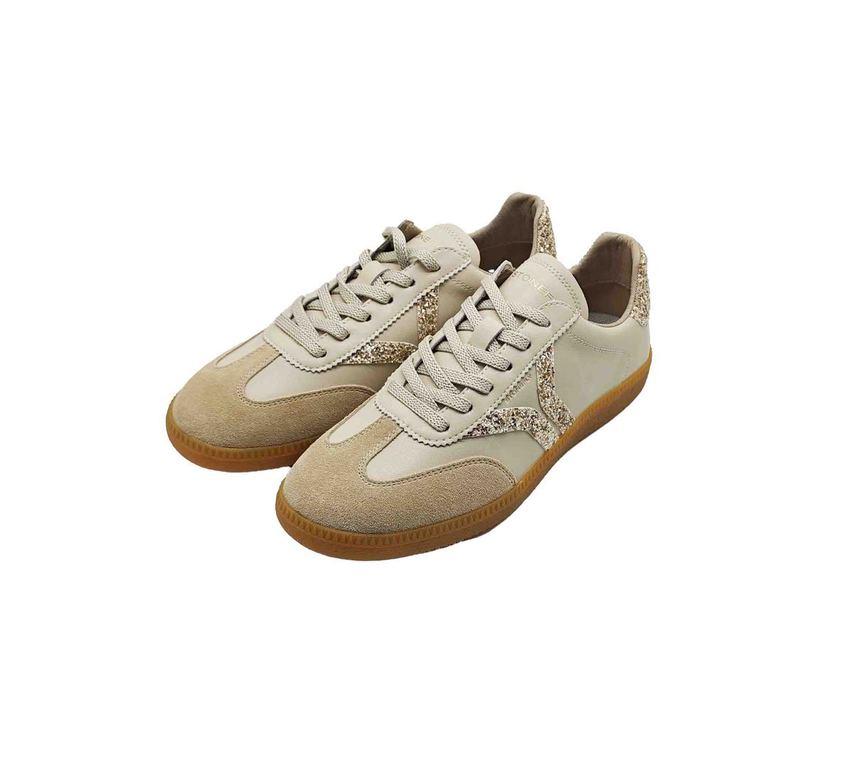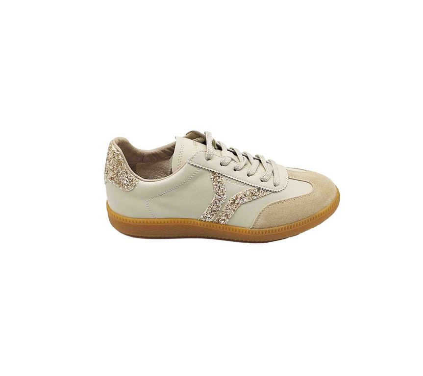Zapatillas StoneFly de piel en tono beige con diseño perforado que garantiza la transpirabilidad y el confort. Cuentan con cordones elásticos con detalle dorado y