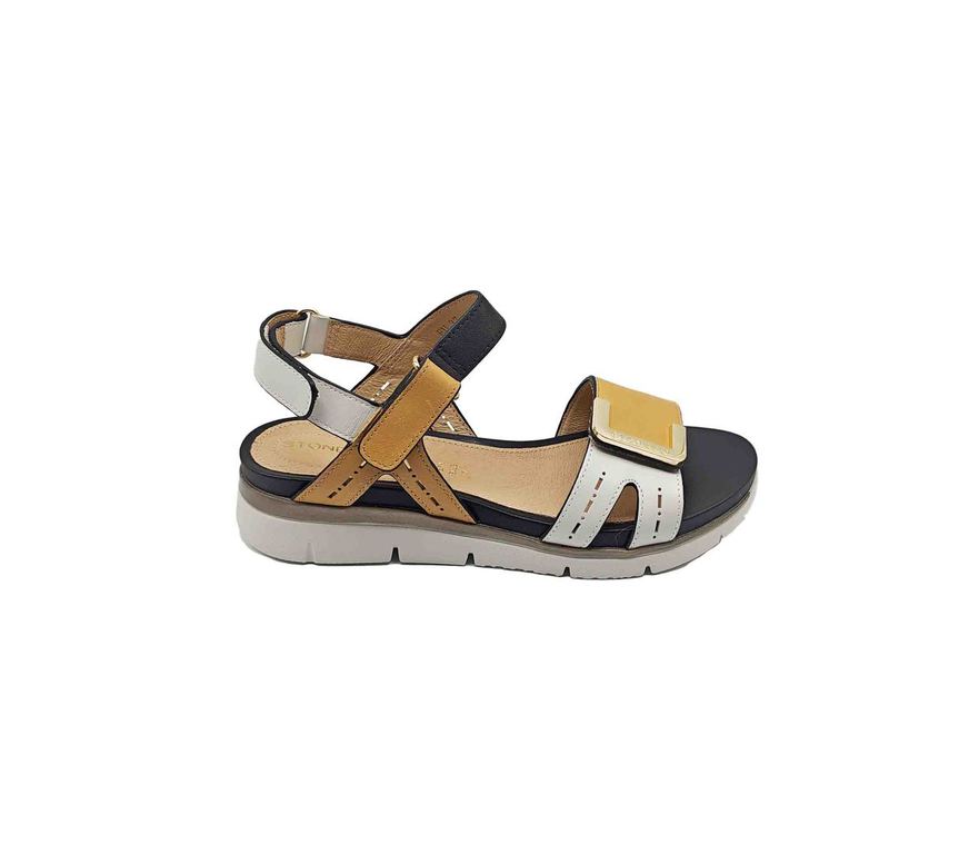 Descubre las sandalias StoneFly multicolor en verde oliva, beige y blanco, con cuña ergonómica de 6 cm total y tiras ajustables con hebilla dorada.