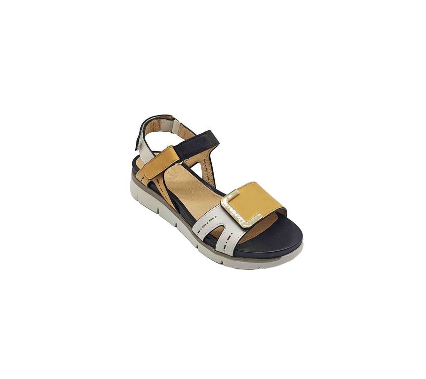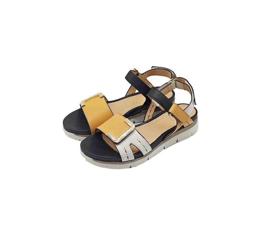 Descubre las sandalias StoneFly bicolor en negro y mostaza vibrante, con plataforma de 6 cm y tiras ajustables con hebilla para un ajuste seguro.